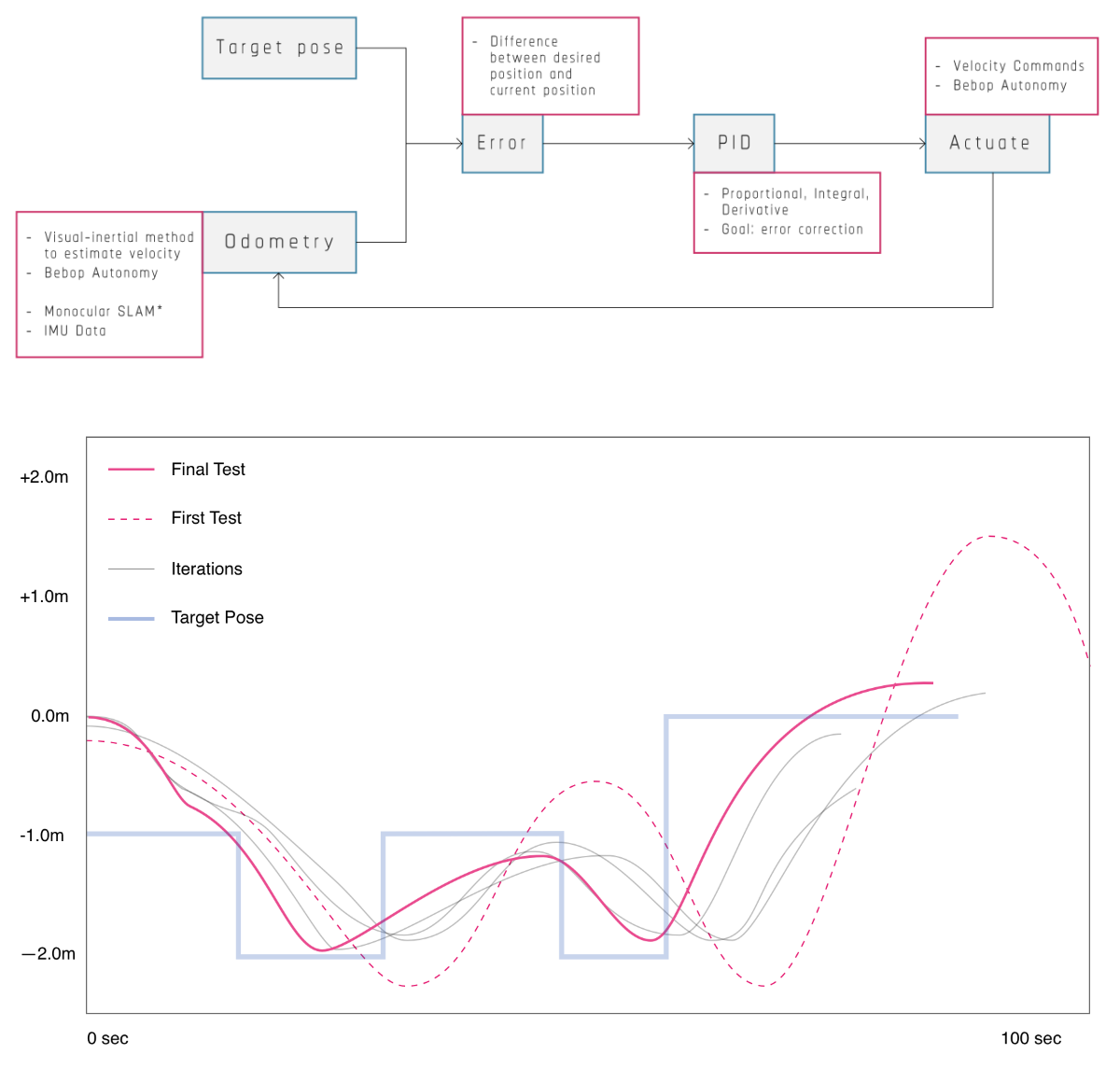The research introduces a PID Controller for autonomous drone navigation. The workflow is developed around ROS Kinetic for Ubuntu 16.04 (Xenial) and Grasshopper visual scripting language for Rhino3D. The current pose of the drone is read by the controller program from topics published by the Bebop Autonomy driver which contains two vectors: position, and orientation; and compares them with the target pose information that is received from Rhino/Grasshopper. The difference between the current and the target pose is the error. The PID controller attempts to minimize the error over time through adjustment of velocity commands for the drone. When the error is reduced to a predefined threshold, the target pose is updated and the drone moves towards the next target pose.
