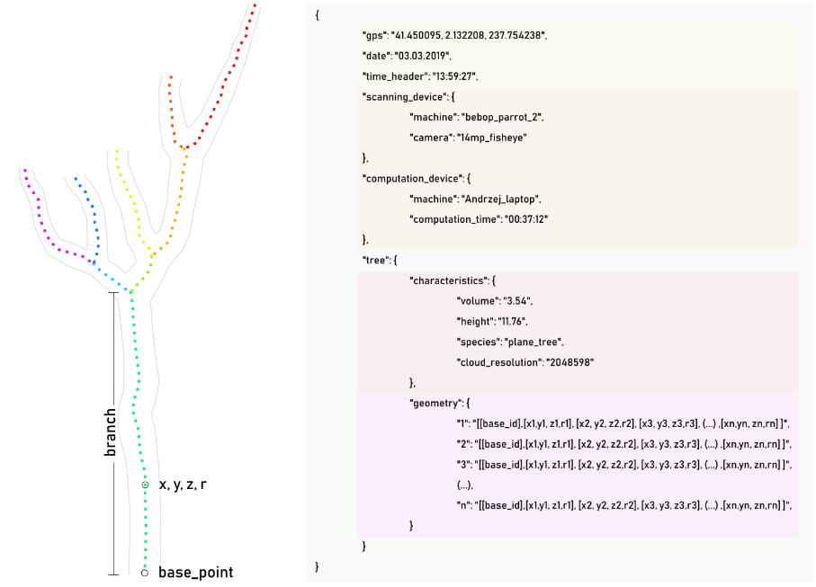Due to the amount of information in the forest, the database needs to be as lightweight and easy to process as possible. The point clouds are neither. After processing, each tree is represented as a collection of skeletal curves with thickness and connection information embedded.