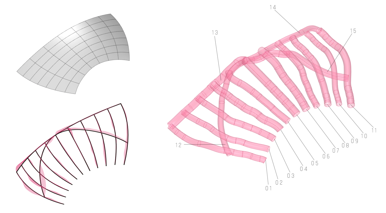From cut pieces, the shading system panel has been fabricated. In the design process, we have used a bottom-up approach, where horizontal pieces were sorted through the curvature to create the most uniform surface.