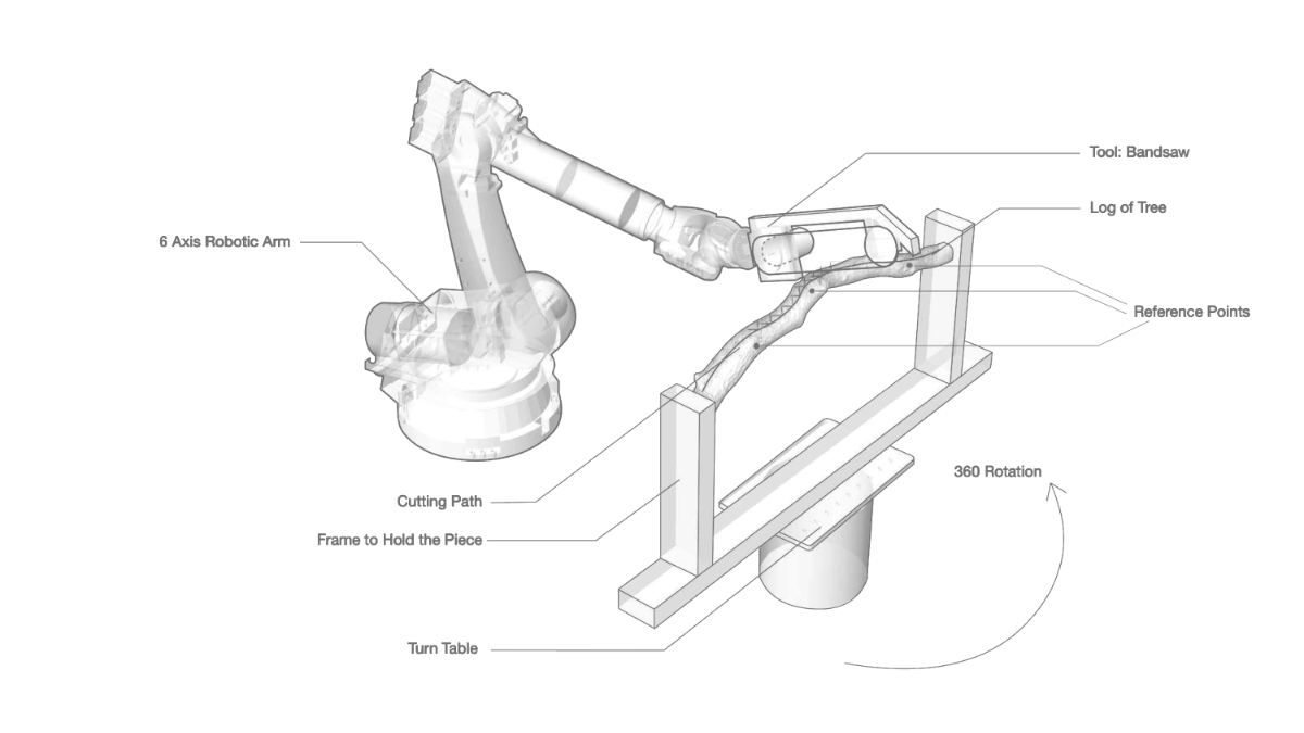 The robotic setup includes a Kuka KR 150 utilized with a bandsaw. The tree log is mounted on a frame attached to the turntable, which acts as a 7th axis for better reachability. To calibrate the piece for the robotic process, we use 3 reference points from the scan of the log. Those points are manually read from the robot tool and the 3d model is adjusted based on that. The cutting path is created from the axis line of the log, following the curvature of the tree.